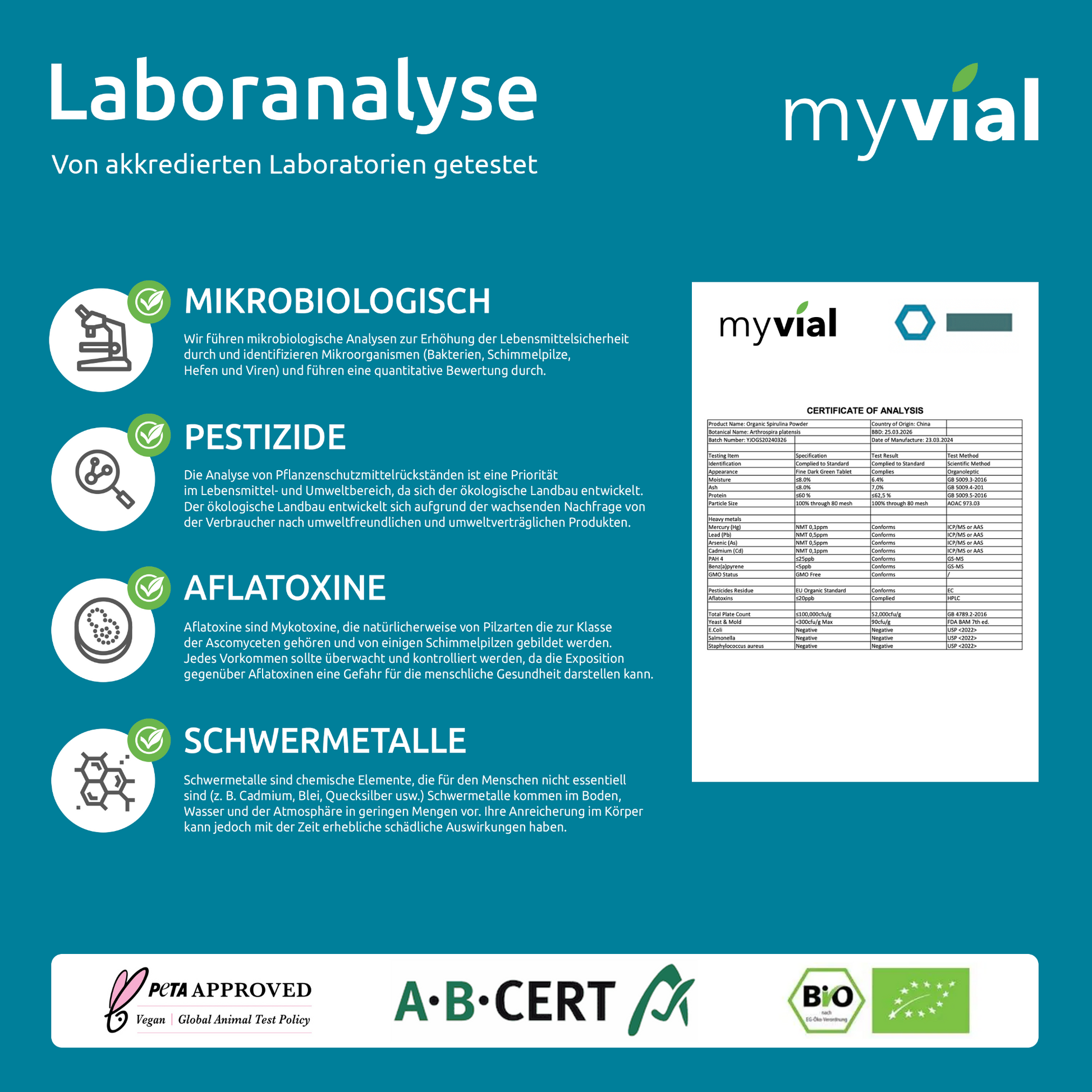 Um eine hohe Qualität zu gewährleisten, wird jeder unserer Rohstoffe von einem deutschen Labor geprüft.